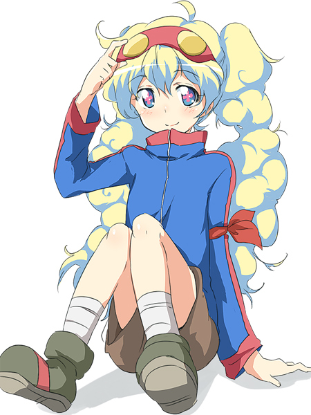 1girlblue eyesblushcosplayfemale focuslong hairsimon (cosplay)simple backgroundsittingsmilesolotwintails