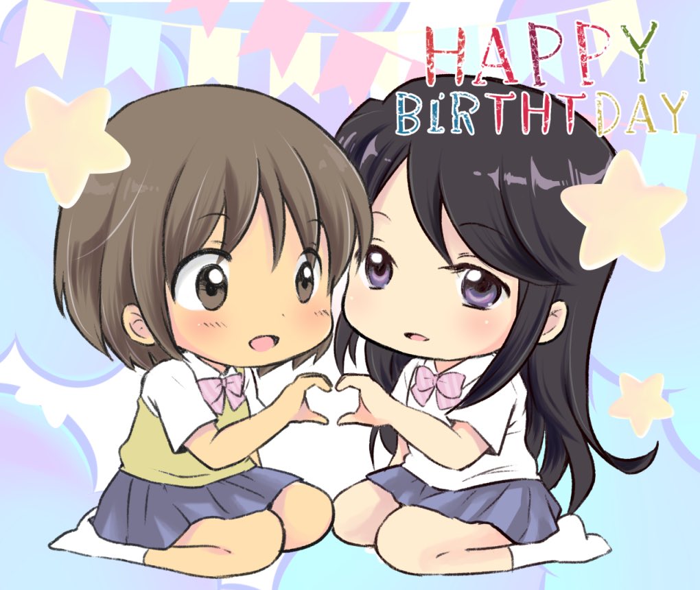 2girlsblack hairbrown hairchibihappy birthdayheartheart handsheart hands duolong hairmultiple girlsschool uniformseizashort hairsitting