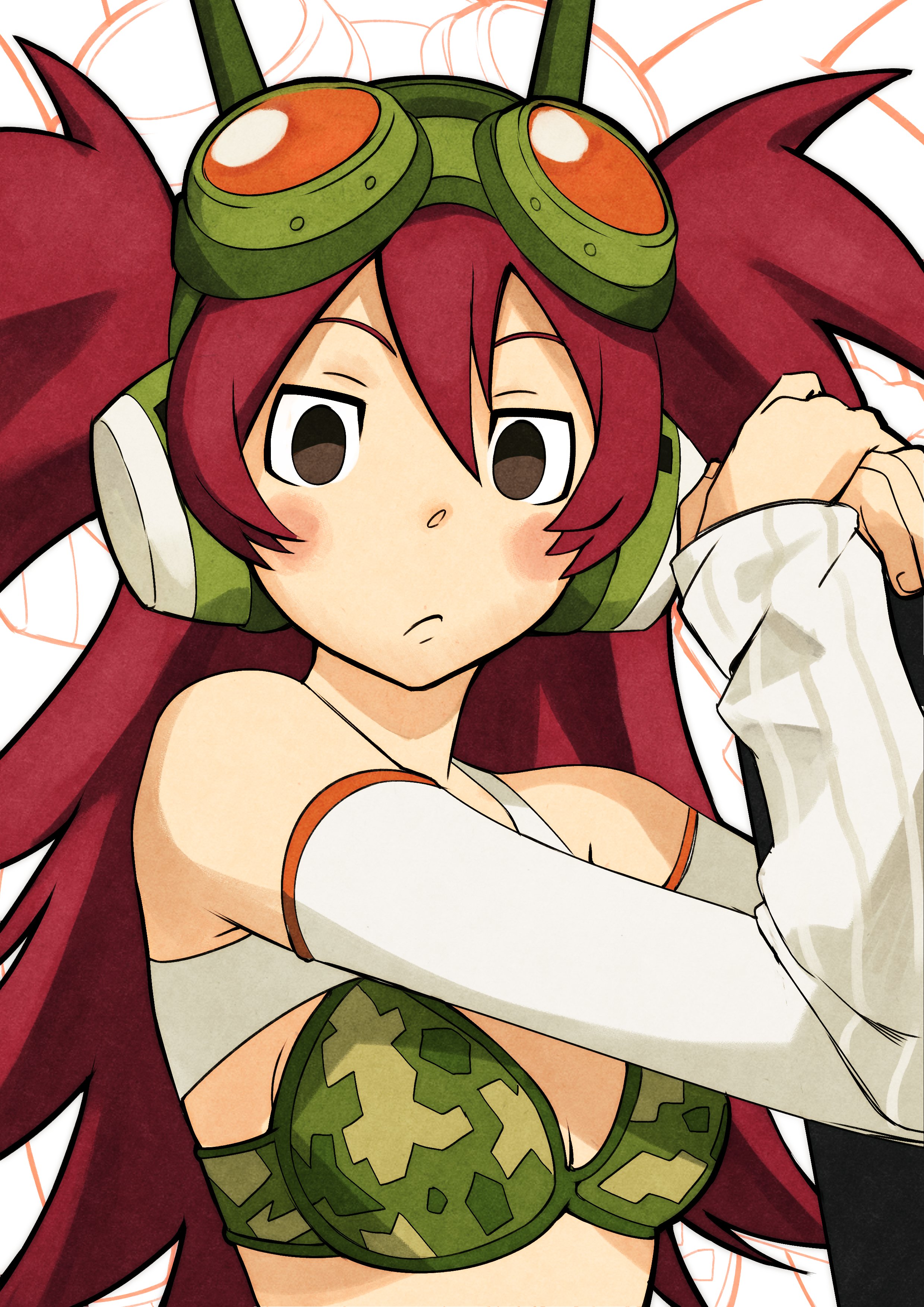 1girlbikinibikini top onlyblushbreastsbrown eyescamouflagecamouflage bikinicleavagedetached sleevesgogglesgoggles on headgreen bikinihair between eyeshands upheadphoneslong hairlooking at viewermedium breastsohkubo atsushi (style)parodyred hairsolostyle parodyswimsuittruck (nifast (greentail))two side upupper bodywhite backgroundwhite sleeves