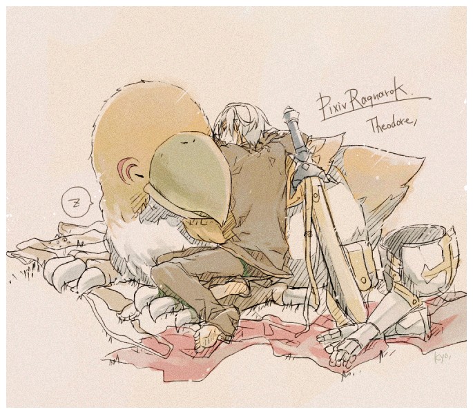1boyarmorbarefootbirdbrown backgroundbrown pantsbrown shirtcharacter nameclosed eyesfull bodygauntletsholdingholding swordholding weaponmale focuspantspauldronsshirtshort hairshoulder armorsittingsleepingsoloswordunworn armorweaponwhite hair