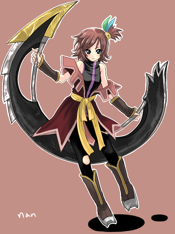 00s1girlbootsbrown backgroundbrown haircharacter namefeather hair ornamentfemale focusgreen eyeshair ornamentknee bootsponytailsolo