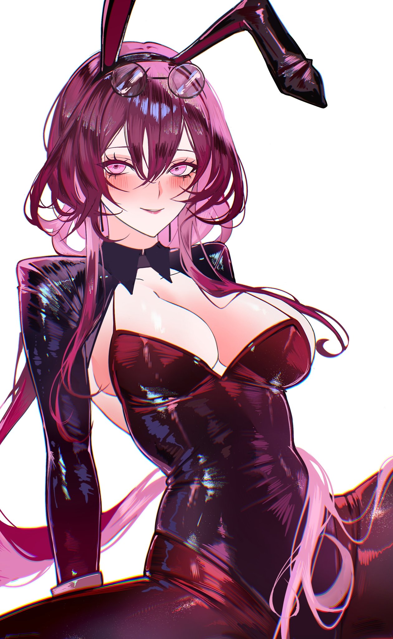 animal earsbreastsclothing cutouteyewear on headhair between eyeslarge breastslong hairlooking at viewerpantyhoseplayboy bunnypurple eyespurple hairrabbit earsround eyewearsmilesolo