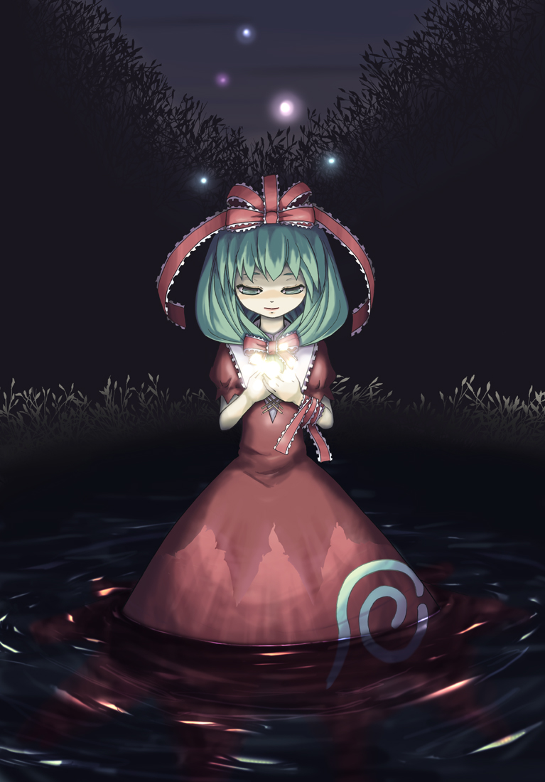 1girlfemale focusfront ponytailgreen eyesgreen hairhair ribbonmatching hair/eyesribbonsolowater