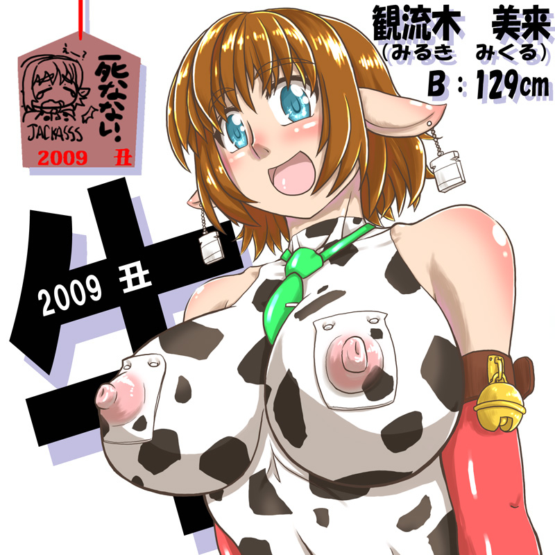 1girlanimal earsanimal printbellblue eyesbreastsbrown haircovered erect nipplescow earscow girlcow printelbow glovesfemale focusgloveshornslarge breastsnipplesopen mouthsee-through clothesshort hairsolothighhighs