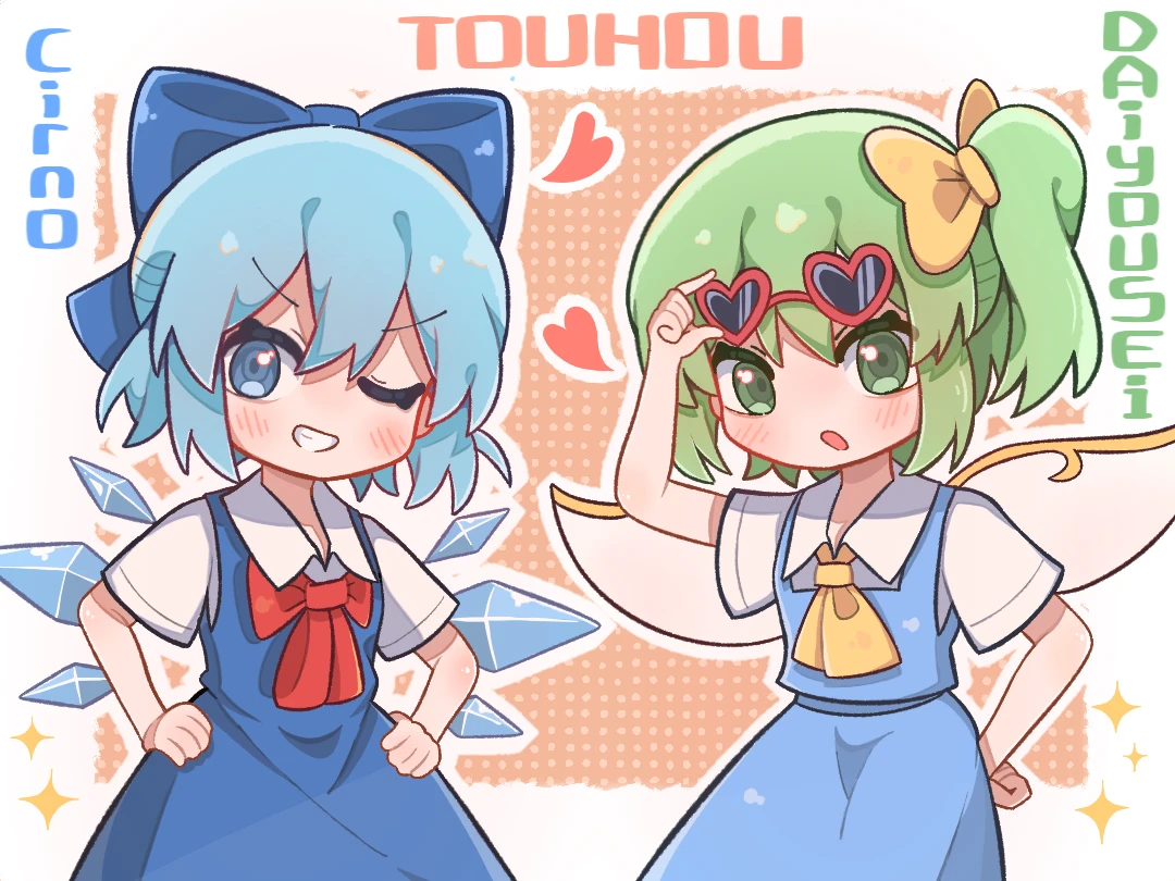 2girlsblue dressblue hairbowchibidressfairygreen hairmultiple girlsone eye closedred bowshort hairsimple backgroundsmilewingsyellow bow