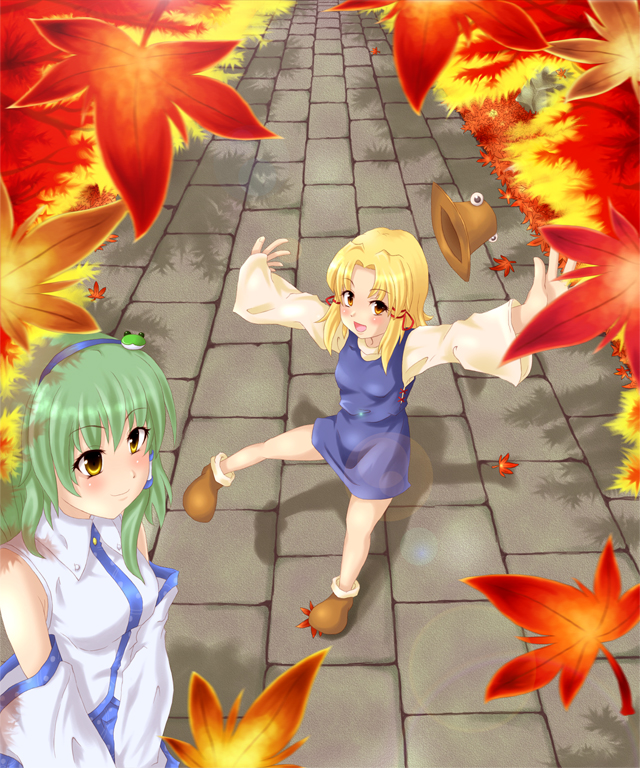 2girlsblonde hairdetached sleevesfemale focusgreen hairhatjapanese clothesleafmikomultiple girlsnatureoutdoorsplantshort hairskirtyellow eyes