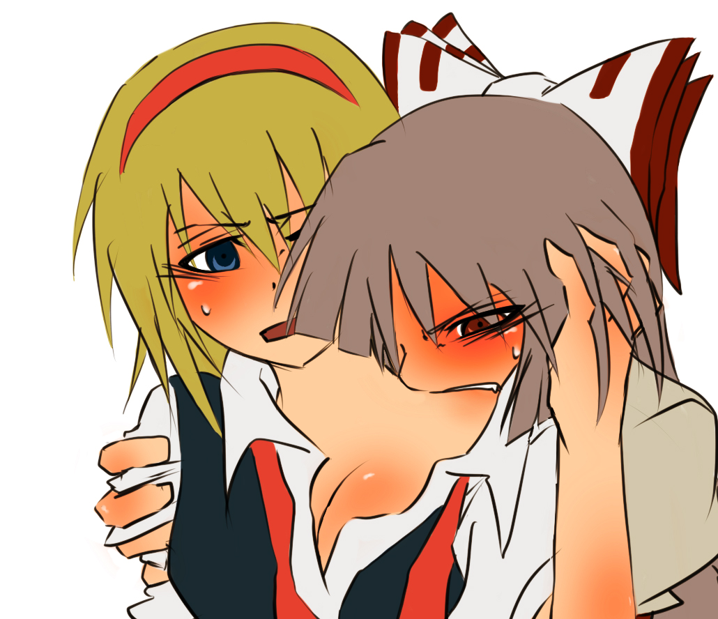 2girlsbitingblonde hairblue eyesblushfemale focushairbandmultiple girlsred eyesribbonshort hair