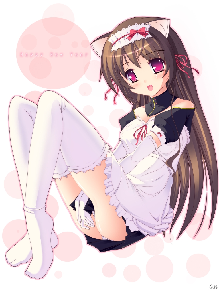 animal earsbrown haircat earslong hairmaidpantiespantyshotred eyessolostriped clothesstriped pantiesthighhighsunderwearwhite thighhighs