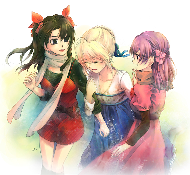 jorotama, big bull, big bull (boku to maou), epros, james (boku to maou), linda (boku to maou), lord stanley hihat trinidad xiv, princess marlene, rosaly, ruka (boku to maou), boku to maou, annotated, highres, 3girls, 5boys, apron, belt, blonde hair, drill hair, green eyes, horns, jacket, microphone, multiple boys, multiple girls, parasol, pink hair, rapier, red eyes, red hair, shadow, sleeveless, star (symbol), sword, thigh strap, tiara, umbrella, weapon, yellow eyes