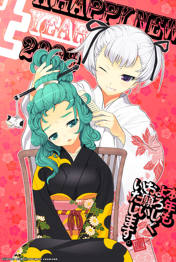 zarzaliel, original, absurdres, highres, 2girls, blonde hair, blue skirt, boots, explosion, green skirt, holding strap, implied violence, kiss, kissing cheek, leaning on person, medium skirt, multiple girls, sitting, skirt, train interior