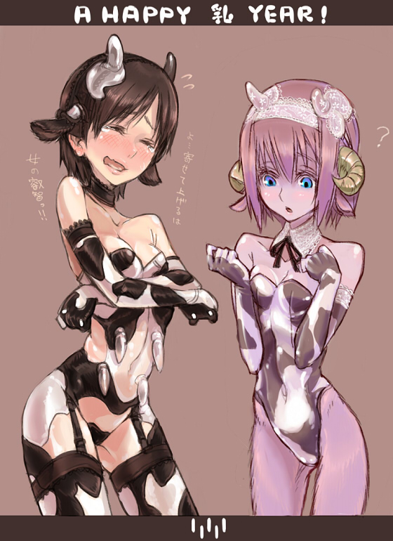 00s20092girlsanimal earsanimal printblue eyesblushbrown haircow printelbow glovesextra earsflat chestgarter beltgloveshornslipsmultiple girlsnew yearpale skinpink hairtearsthighhighs