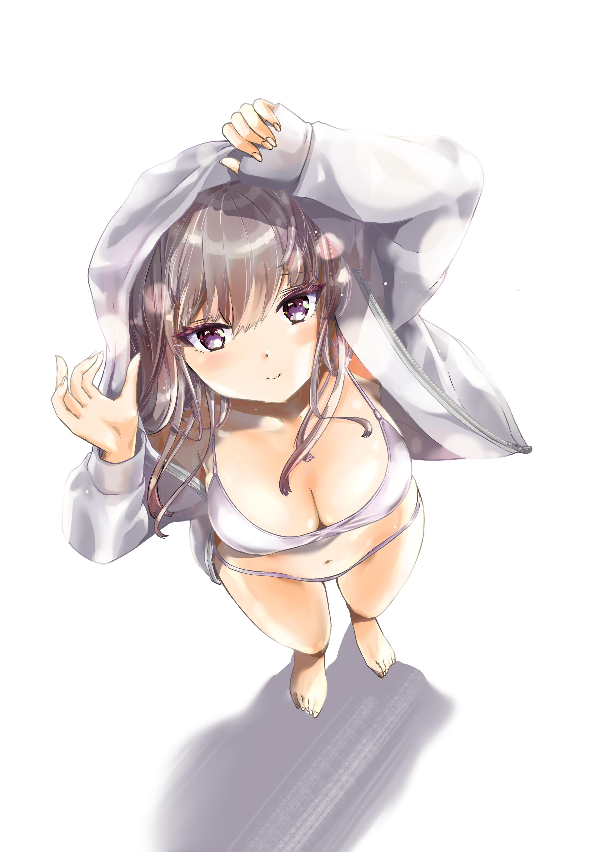 1girlbarefootbikinibreastsbrown eyesbrown haircleavageclosed mouthfrom abovefull bodyitsumoto roijacketlooking at viewermedium breastsnavelopen clothesopen jacketshadowsimple backgroundsmilesolostandingswimsuitwhite backgroundwhite bikiniwhite jacket