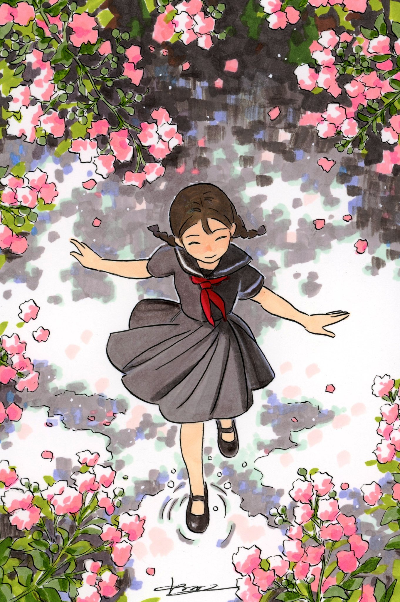 1girlbraidbrown haircherry blossomsclosed eyesflowerfrom abovelong hairneckerchiefoutstretched armspetalspink flowerschool uniformserafukushanzichatishoessmilesolospread armsstandingtwin braidswater