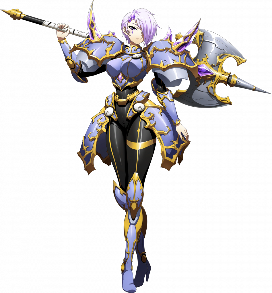 1girlarm at sidearmorarmored bootsaxebandaged weaponbattle axeblack bodysuitblue armorbodysuitboobplatebootsbreastplatebreastscrossed legscrystalcrystallizationfull bodygold trimhair over one eyehigh heel bootshigh heelsholdingholding axeholding weaponknee guardslight frownlooking at viewerover shoulderparted hairpurple eyespurple hairseriousshort hairsimple backgroundsolostandingtachi-etransparent backgroundvambraceswarriorweaponweapon over shoulder