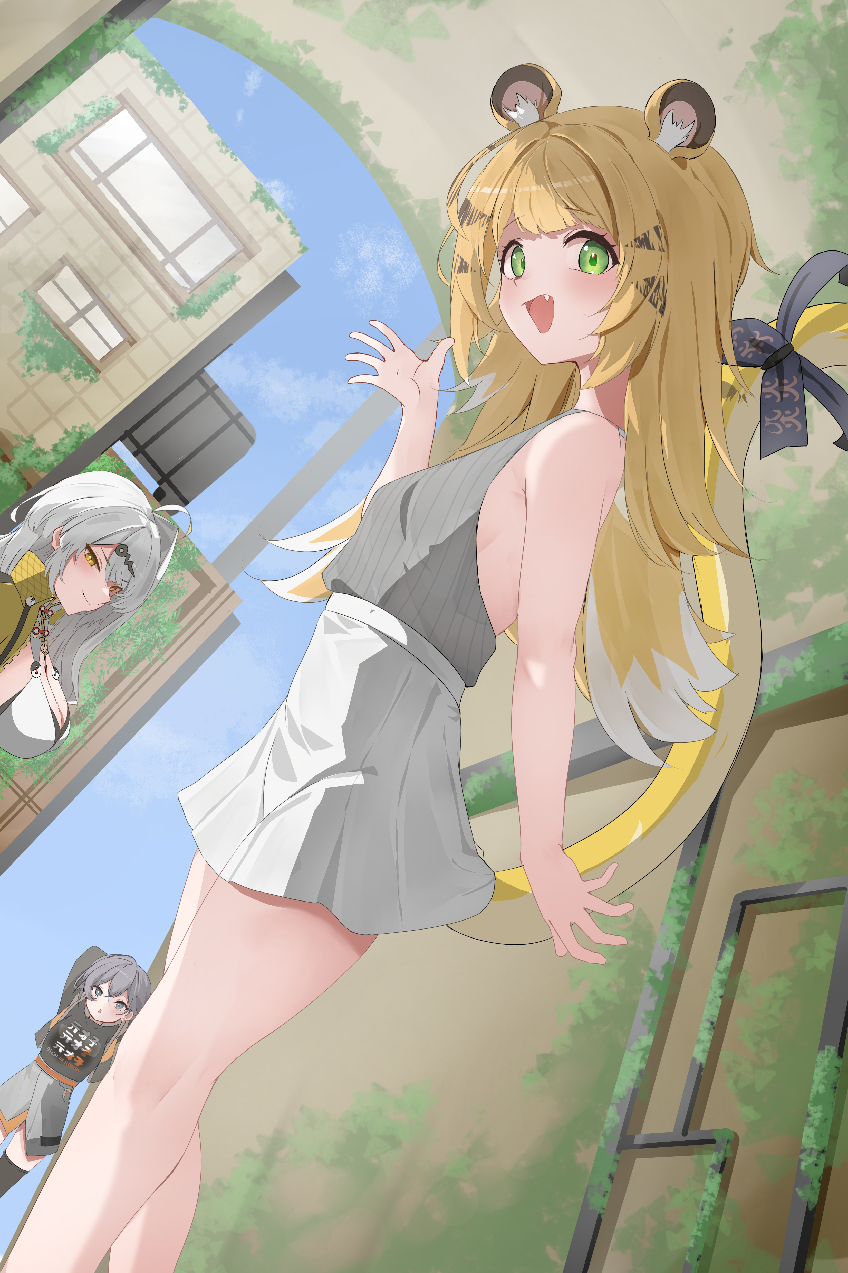 notamaru 2, kipfel (vrchat), mamehinata, vrchat, commentary request, highres, translation request, 2girls, :3, :d, ahoge, animal ear fluff, animal ears, black necktie, black shoes, black skirt, blue eyes, blush stickers, bottle, brown hair, cat ears, cat girl, cat tail, collared shirt, double-parted bangs, green background, green shirt, green sweater vest, hair between eyes, holding, holding bottle, laser, long hair, long sleeves, looking at viewer, multiple girls, necktie, open mouth, outline, pleated skirt, shirt, shoes, skirt, smile, socks, soda bottle, standing, striped background, sweater vest, tail, white outline, white shirt, white socks
