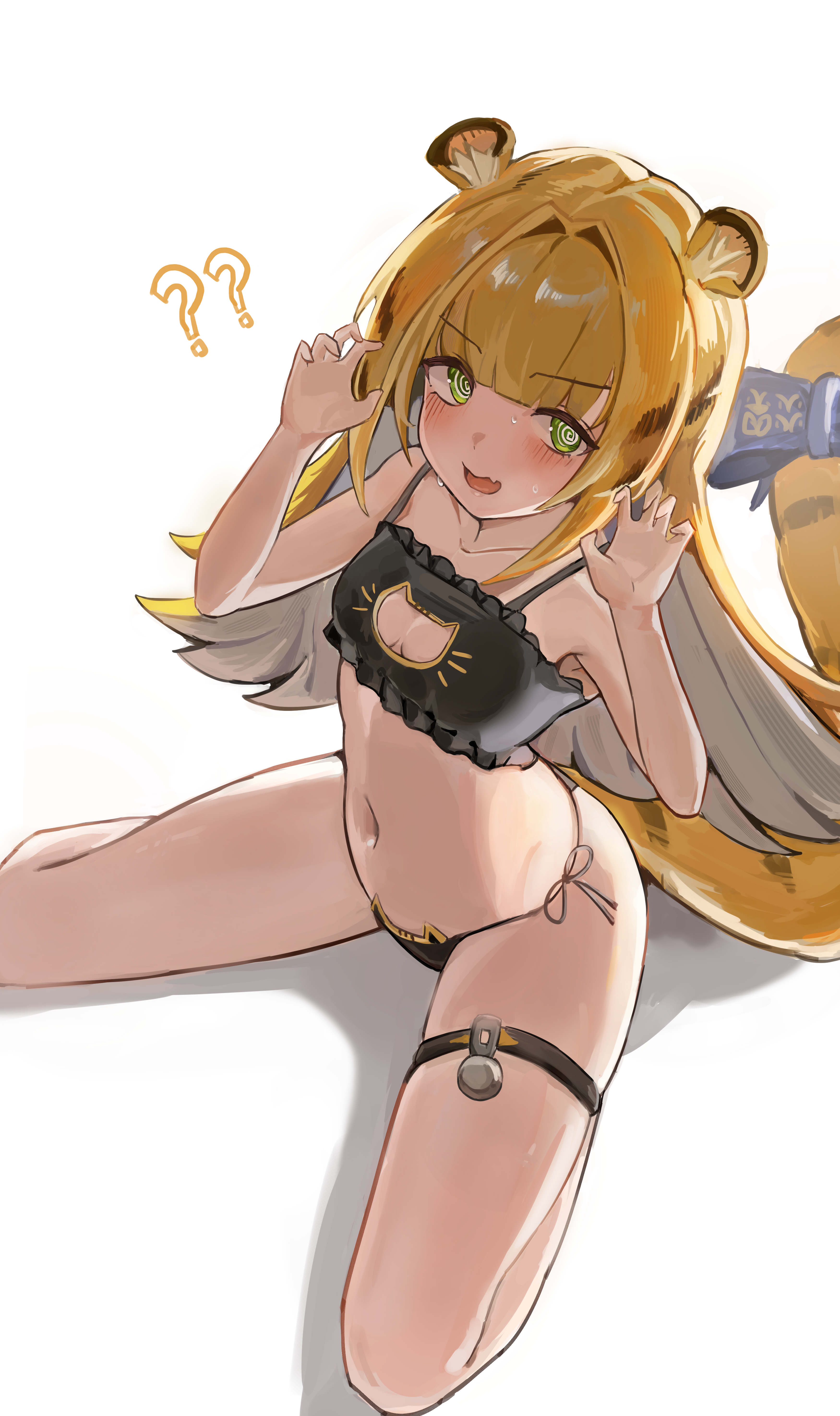 durindana 7, original, highres, tagme, black bra, black panties, bottle between breasts, bra, breasts, brown eyes, brown hair, holding, holding phone, large breasts, navel, off shoulder, panties, phone, spoken blush, underwear