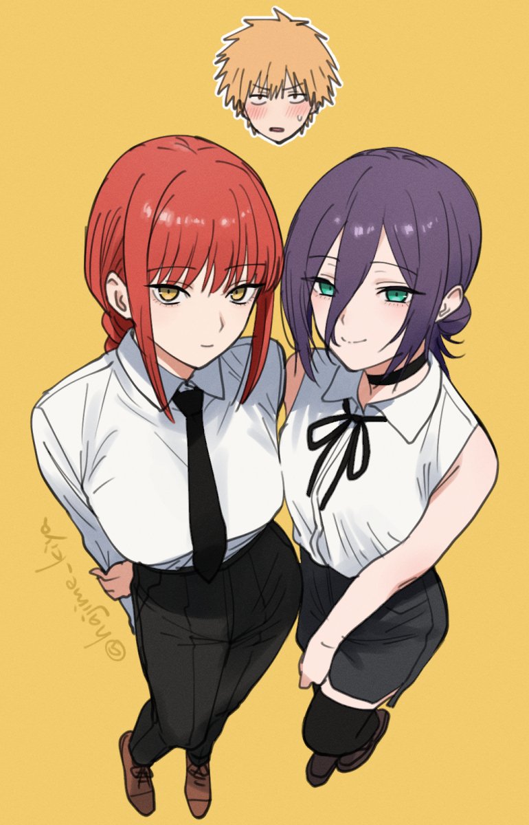 1boy2girlsblack chokerblack hairblack necktieblack pantsblack ribbonblonde hairblushbraidbraided ponytailbreastsbrown shoeschokercollared shirtgreen eyeshair between eyeshair bunlong hairlong sleeveslooking at viewermedium hairmultiple girlsneck ribbonnecktiepantspurple hairred hairribbonringed eyesshirtshoesshort hairsidelockssimple backgroundsleevelesssleeveless shirtsmilestandingsweatdropwhite shirtyellow backgroundyellow eyes