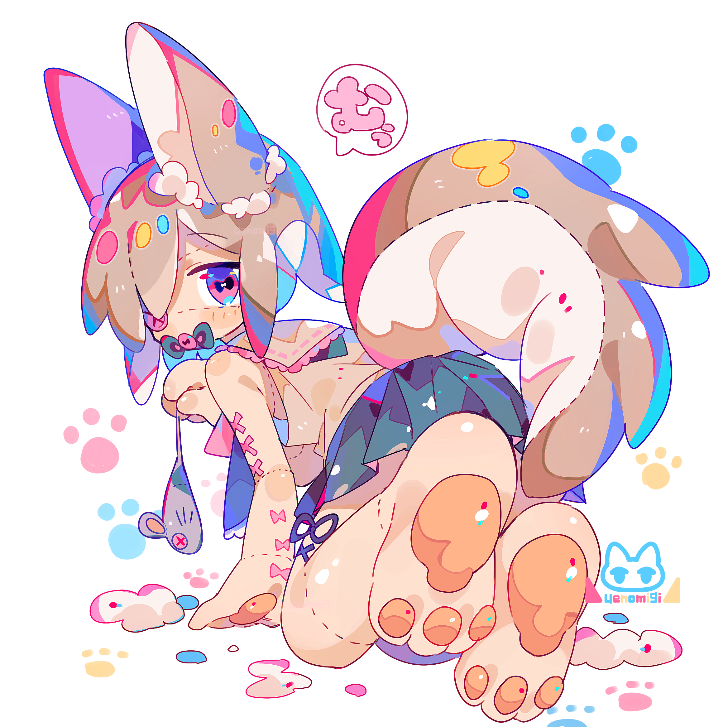 1girlall foursanimal earsbare shouldersbarefootblue skirtblush stickersbrown haircat earscat girlcat taildotted linefull bodylooking at viewerlooking backpink eyespleated skirtshirtshort hairsignaturesimple backgroundskirtsleevelesssleeveless shirtsolessolotailwhite backgroundwhite shirt