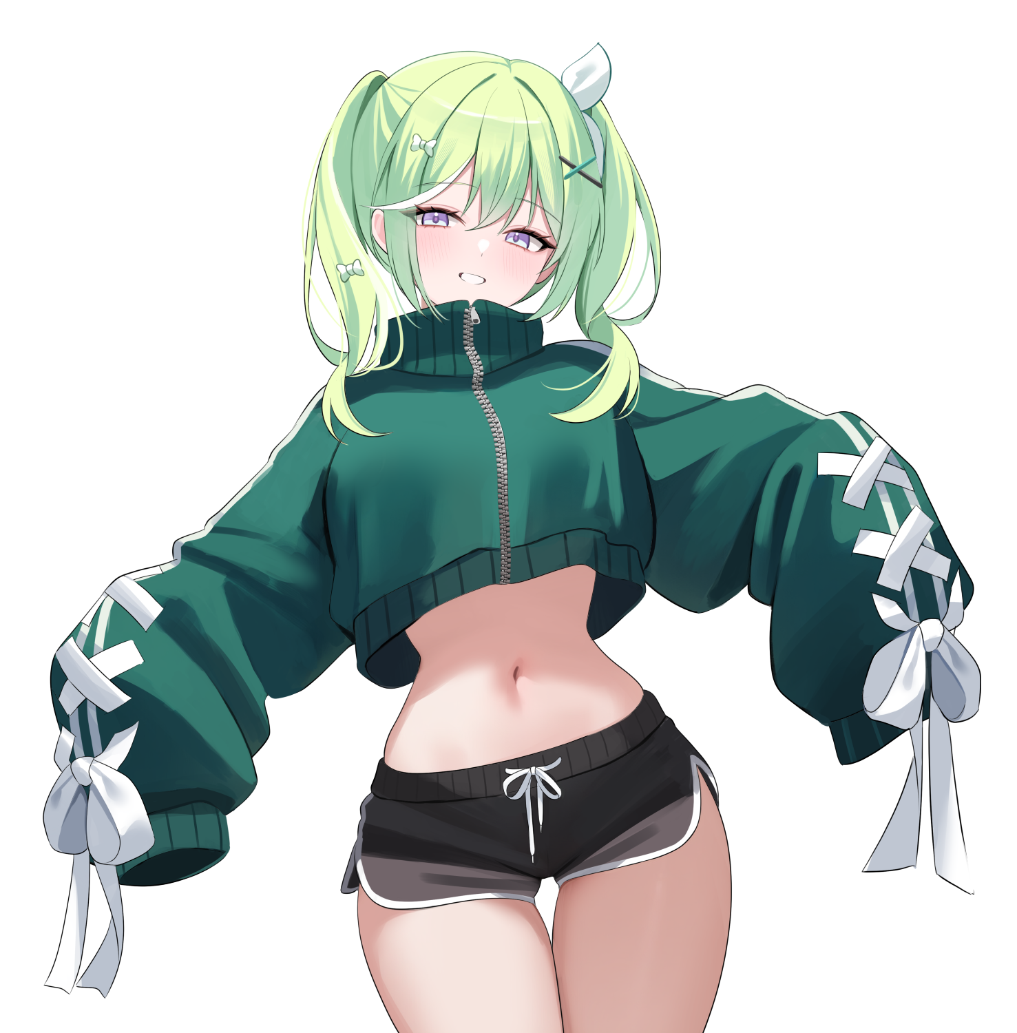 1girlblack shortsbowbreastscowboy shotcrop topcrop top overhangcropped jacketdolphin shortsdrawstringgreen hairgreen jacketgrinhair bowhair ornamenthair ribbonjacketlong hairlong sleeveslooking at viewermidriffmulticolored hairnaveloutstretched armspurple eyesribbonshort shortsshortssimple backgroundsleeves past fingerssleeves past wristssmilesolostomachstreaked hairthigh gapthighstrack jacketturtleneckturtleneck jackettwintailsvirtual youtuberwhite backgroundwhite ribbonx hair ornamentzipperzipper pull tab