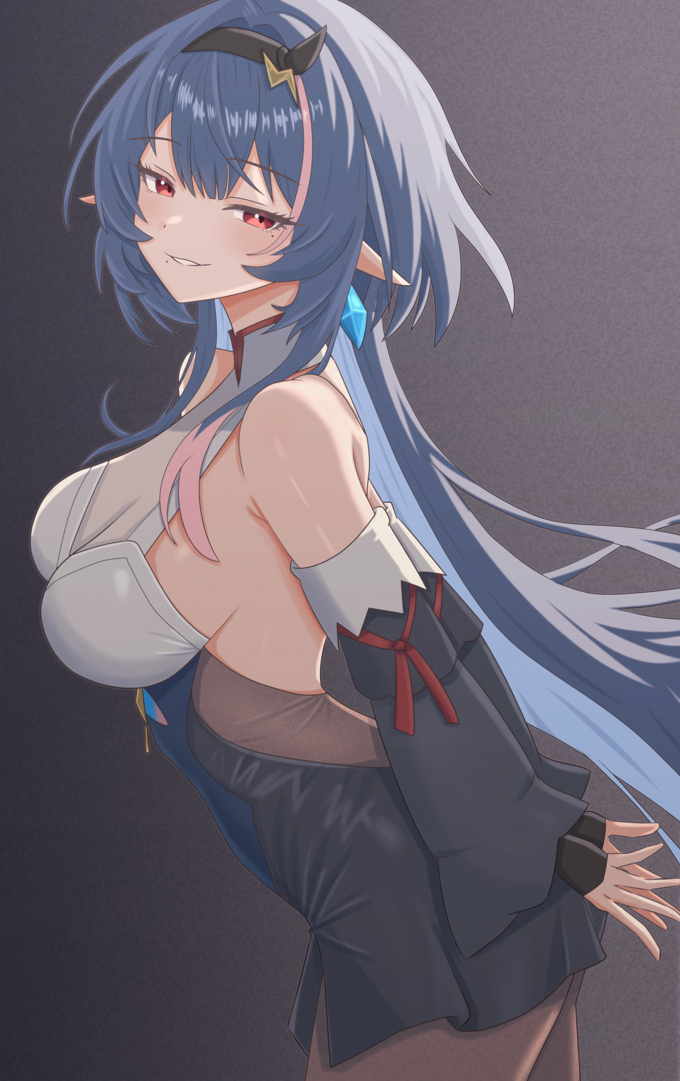 1girlarms behind backbare shouldersblack dressbreastsbrown pantyhosecowboy shotdetached sleevesdressfrom sidegradient backgroundgrey backgroundgrey hairgrinhairbandlong hairlong sleeveslooking at viewermedium breastsmolemole under eyemole under mouthmulticolored hairpantyhosepointy earsred eyessee-through cleavagesee-through clothessleevelesssleeveless dresssmilesolostreaked hairvery long hair