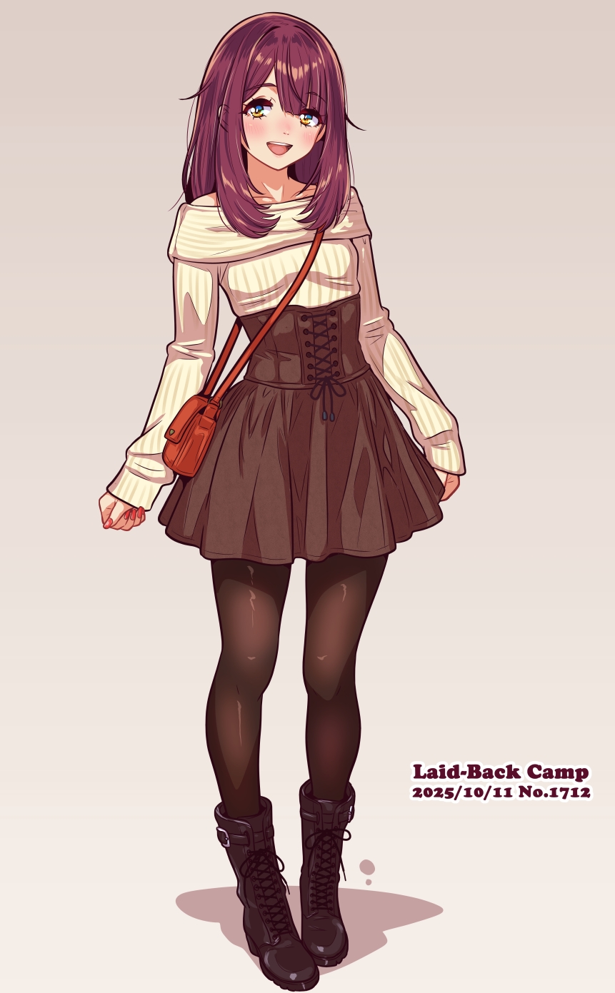 1girlbagblack corsetblack pantyhoseblack skirtbootsbrown haircorsetdatedfull bodygrey backgroundhandbaglooking at viewermedium hairoff shoulderoff-shoulder sweateropen mouthpantyhosered bagsimple backgroundskirtsolostriped clothesstriped sweatersweateryellow eyesyellow sweater
