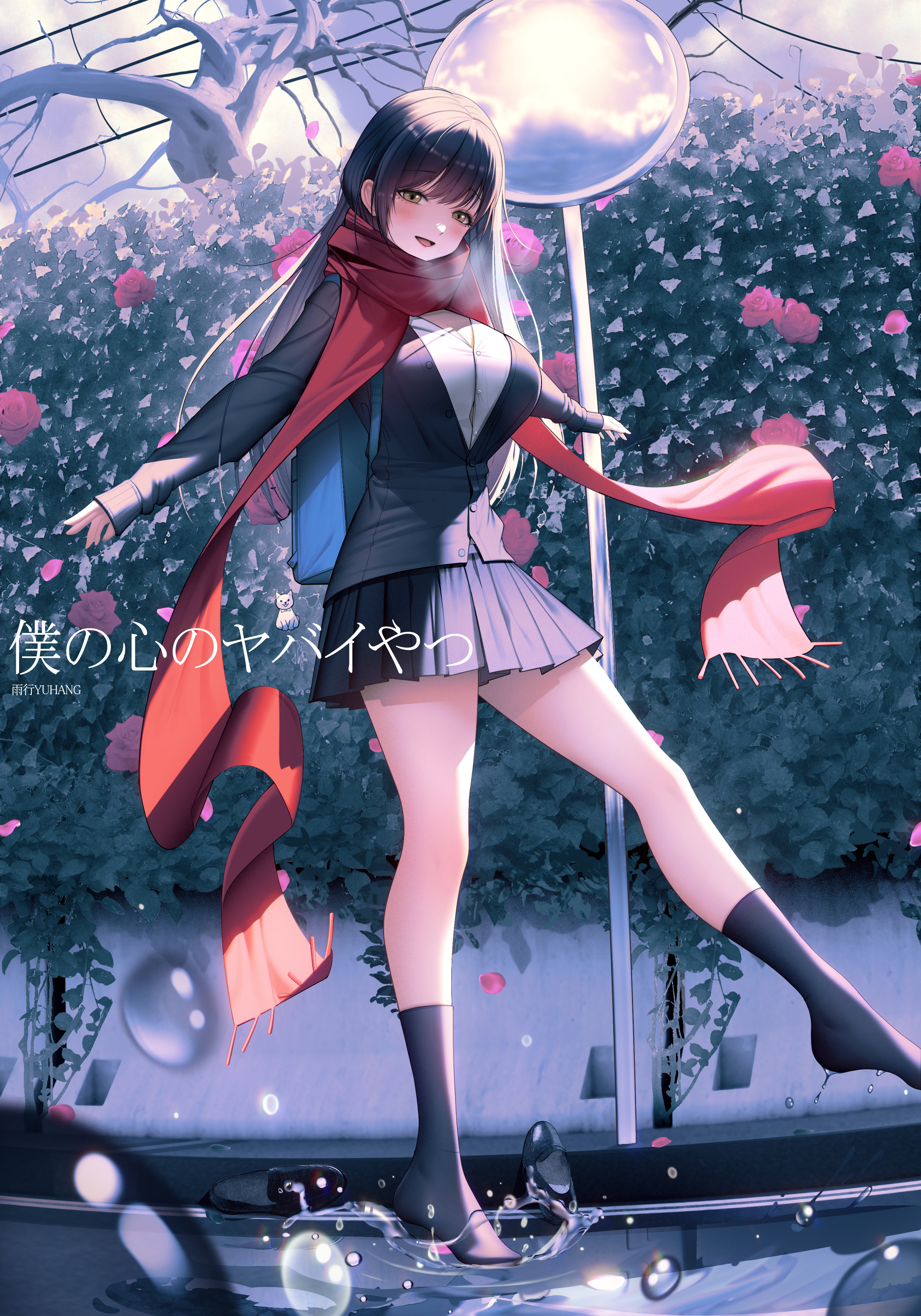 himitsu (iemaki), wakaba mutsumi, bang dream!, highres, 1girl, ascot, beret, black feathers, earrings, feathers, finger to own chin, fingernails, gradient background, green hair, hat, index finger raised, jewelry, long hair, looking at viewer, nail polish, pink hair, pink nails, portrait, solo, sparkle, two-tone background, white ascot, white background, yellow eyes