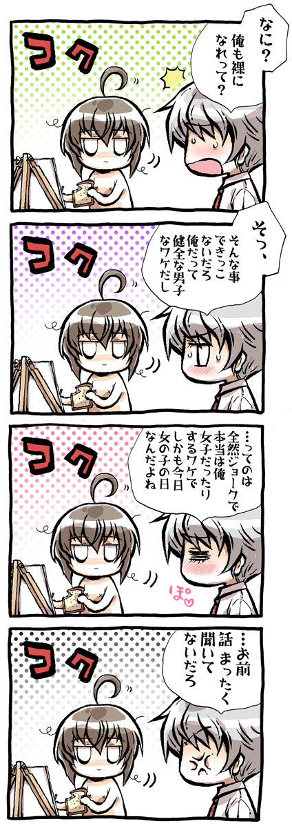 iizuki tasuku, kos-mos, shion uzuki, xenosaga, xenosaga episode iii, wallpaper, apron, blue hair, blush, breast press, breasts, brown hair, glasses, green eyes, maid, maid headdress, naked apron, red eyes, ribbon, symmetrical docking, yuri