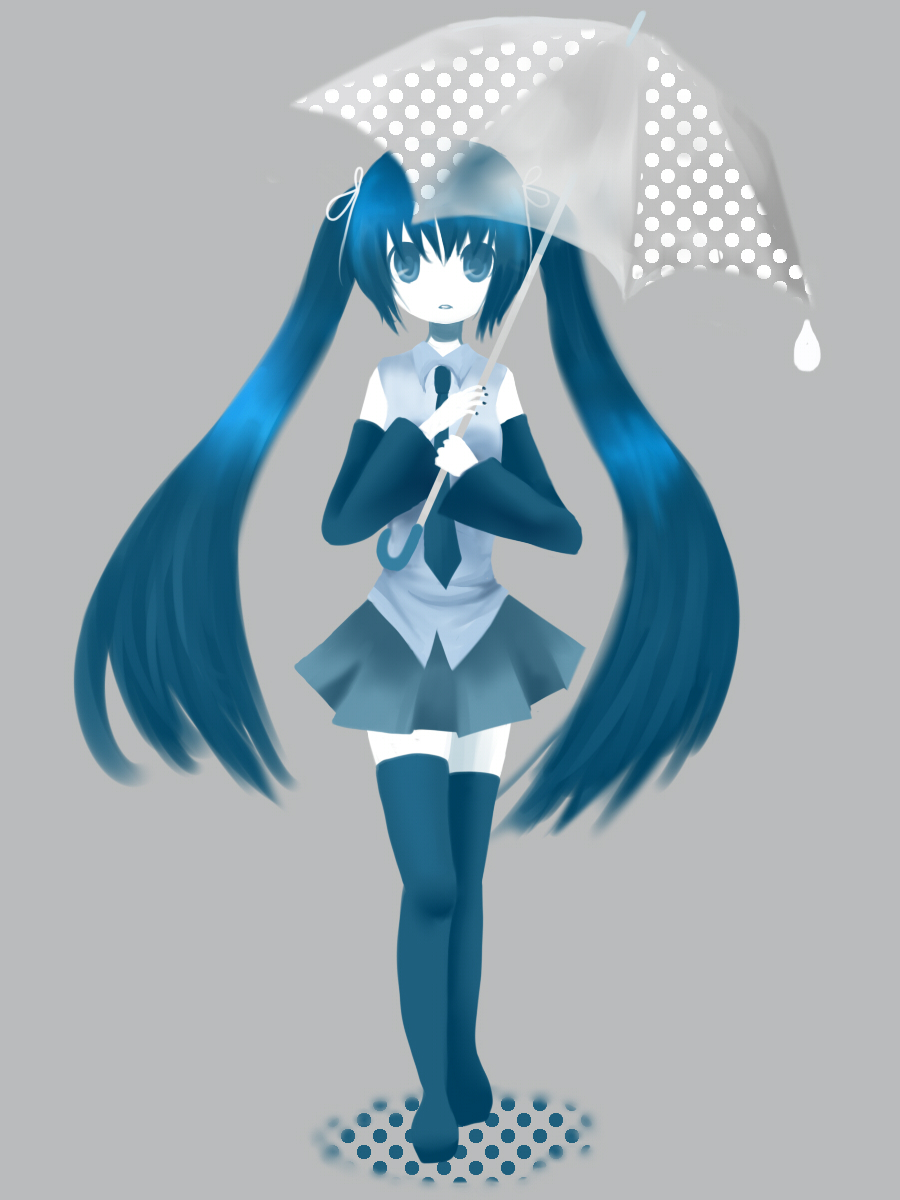 blue eyesblue hairblue themedetached sleeveslong hairmonochromenecktieskirtsolothighhighstwintailsumbrellavery long hair