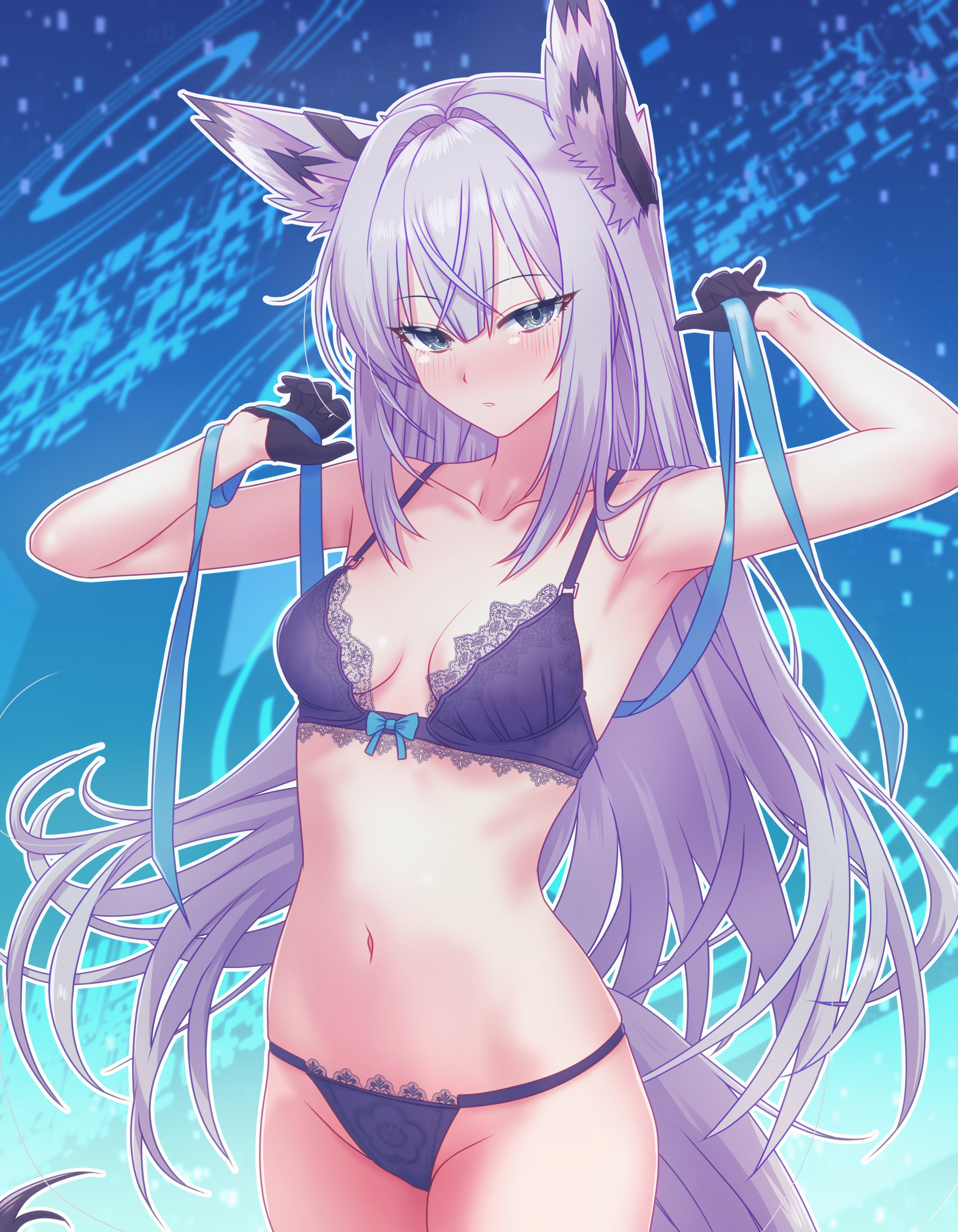 1girlanimal earsarmpitsbare shouldersblack glovesblue backgroundblue bowblue brablue pantiesblue ribbonblushbowbrabreastscollarbonecowboy shotfox earsfox girlfox tailglovesgrey eyesgrey hairhair between eyeshalf gloveshands upholdingholding ribbonlacelace trimlace-trimmed bralace-trimmed pantieslong hairlooking at viewermedium breastsnavelpantiesparted lipsribbonsidelockssolostomachtailunderwearunderwear only