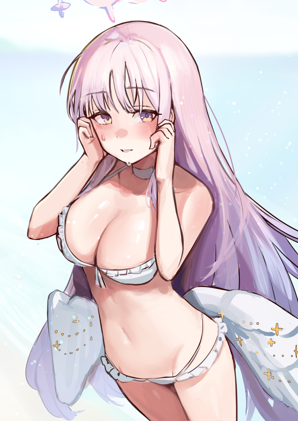 1girlbare armsbare shouldersbeachbikiniblurryblurry backgroundblushbreastschokercleavagecowboy shotdayfrilled bikinifrillsfront-tie bikini topfront-tie tophalohands on own cheekshands on own facehands uplarge breastslight particleslong hairlooking at viewerlow wingsmulti-strapped bikini bottommulticolored eyesnaveloceanofficial alternate costumeoutdoorsparted lipspink hairpink halopurple eyessolostandingstomachswimsuitvery long hairwetwhite bikiniwhite chokerwhite wingswingsyellow eyes