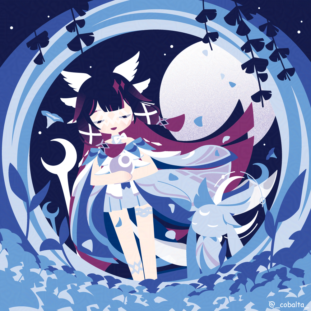 :d1girlblack hairclosed eyesfloating hairfull moongradient hairhair ornamentholdinglong hairluonnotar (genshin impact)moonmulticolored hairopen mouthpurple hairsidelockssmilesolotwitter usernamewing hair ornament