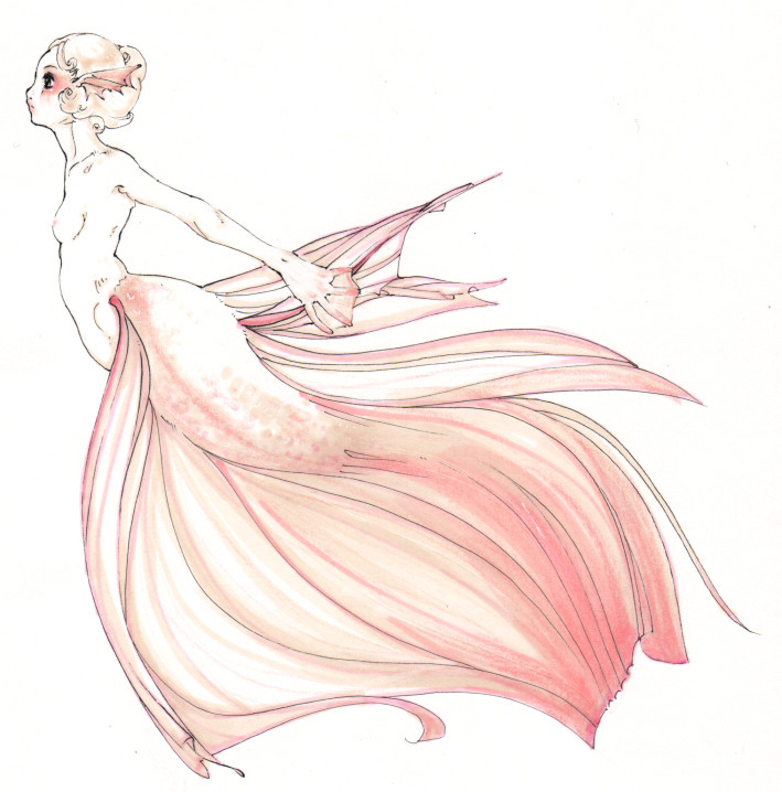 1girlbreastsfantasyfemale focusfinsfishmermaidmonster girlnipplespink hairsimple backgroundsmall breastssolowhite background
