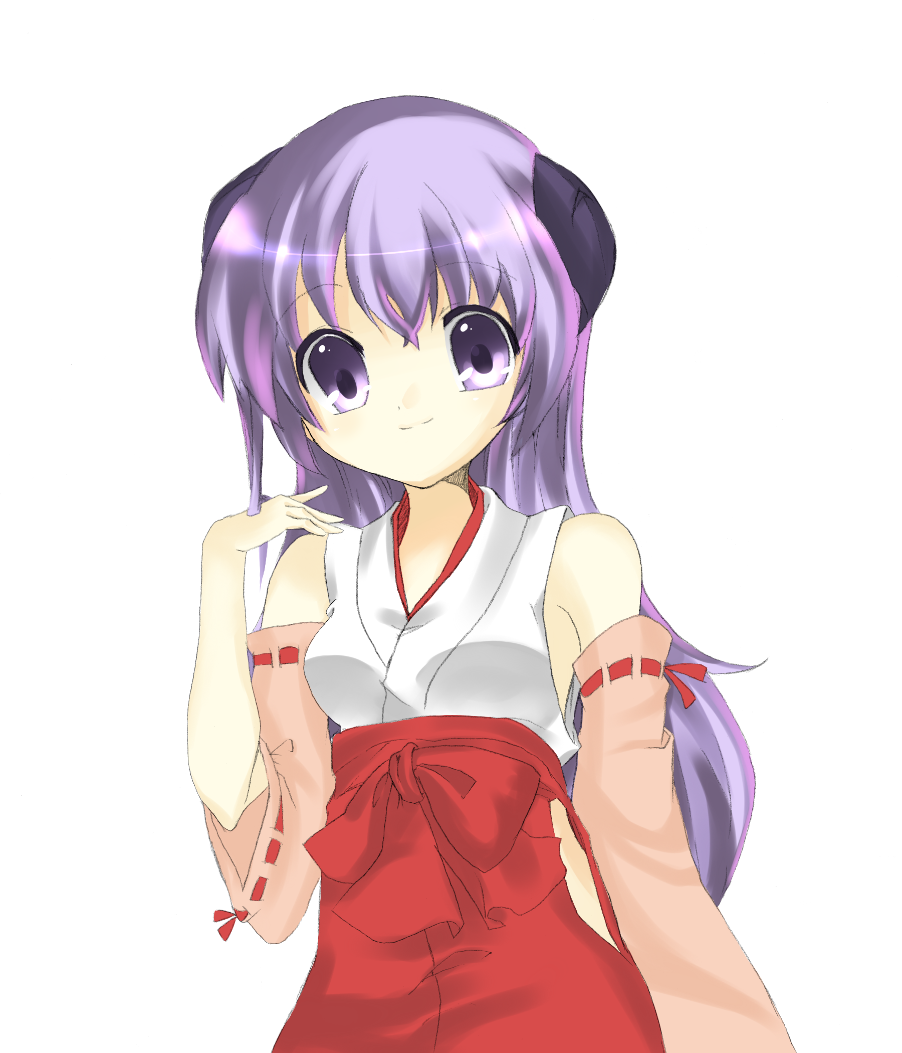 00s1girldetached sleevesfemale focushakamahakama skirthornsjapanese clotheslong hairmikopurple eyespurple hairred hakamaskirtsolo