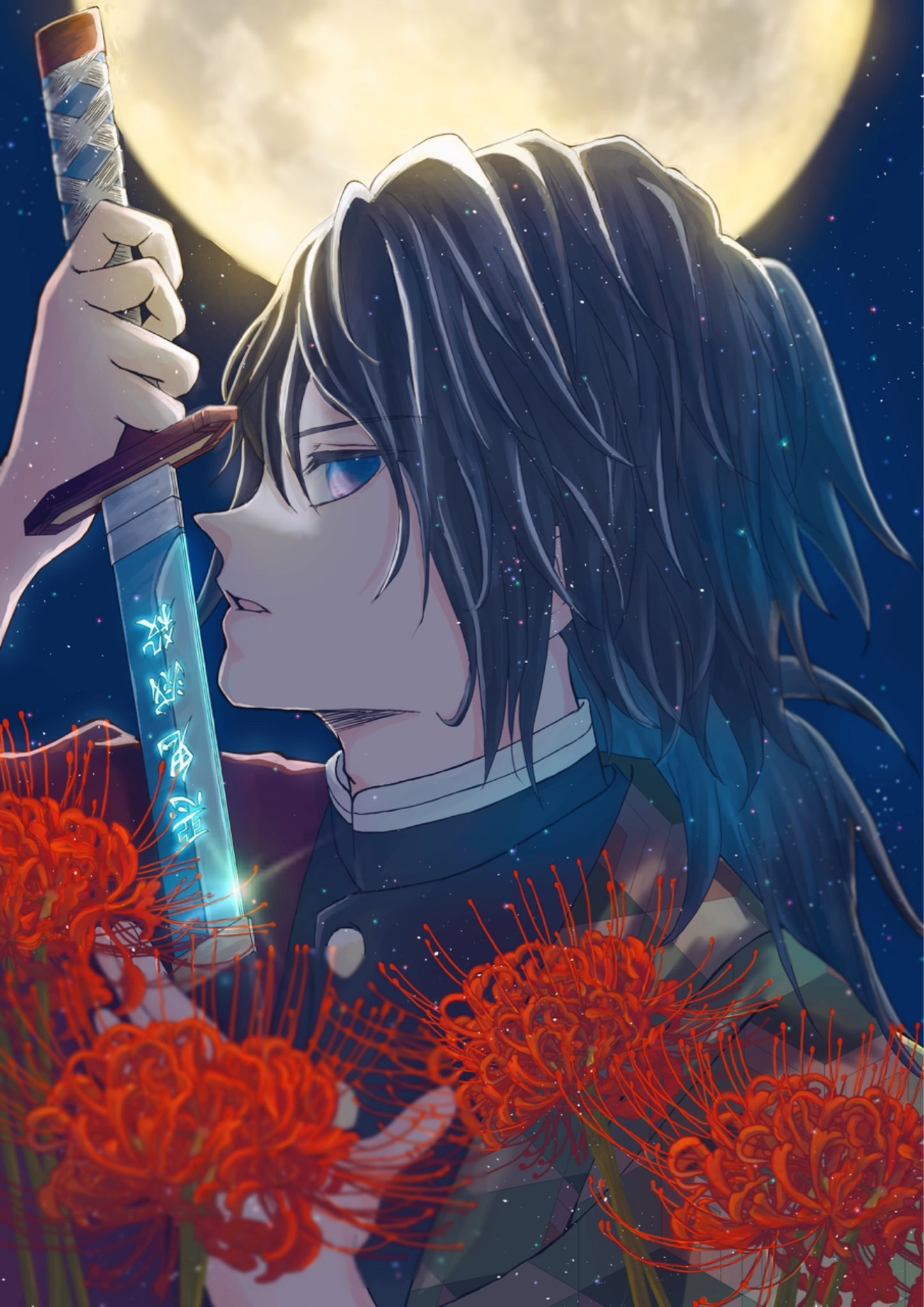 1boyblack hairblack jacketblue eyesbuttonsdemon slayer uniformgold buttonshaorihigh collarholdingholding swordholding weaponjacketjapanese clotheskatanakikkoumonlooking at viewerlow ponytailmale focusmoonparted lipsponytailprint haoriprofilered haorisolospiked hairswordteethweapon