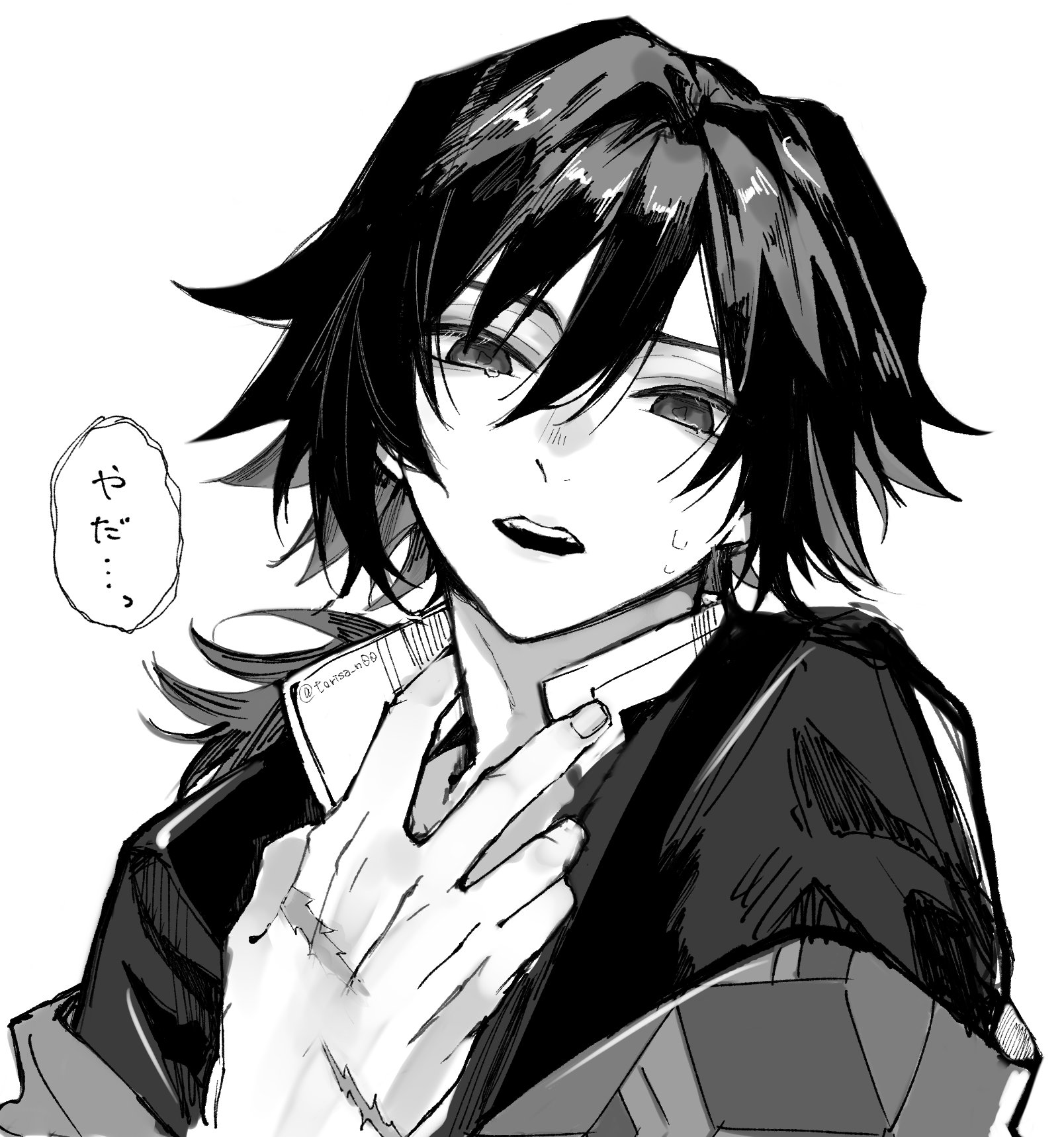 1boyblack hairblack jacketdemon slayer uniformempty eyesgreyscalehand uphaorihigh collarjacketjapanese clotheskikkoumonlooking at viewerlow ponytailmale focusmonochromeopen mouthponytailprint haorisolospeech bubblespiked hairsweatdropteethtorisa n00upper teeth only