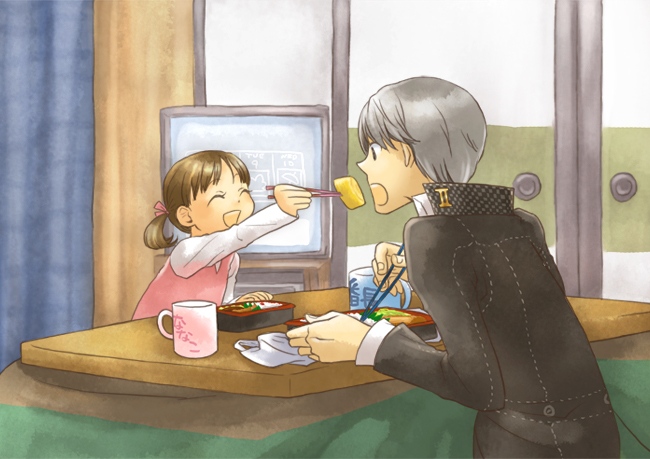 bentobrown hairchildclosed eyescupeatingfeedingfoodkotatsumugshort hairshort twintailsslice of lifesliding doorssmiletabletelevisiontwintails