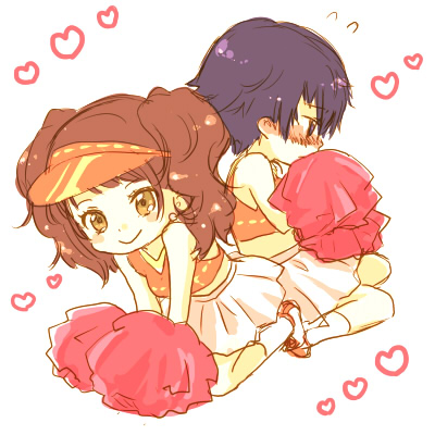 blue hairblushcheerleaderchibiheartpom pom (cheerleading)red hairshort hairskirtsmiletwintailsyellow eyes