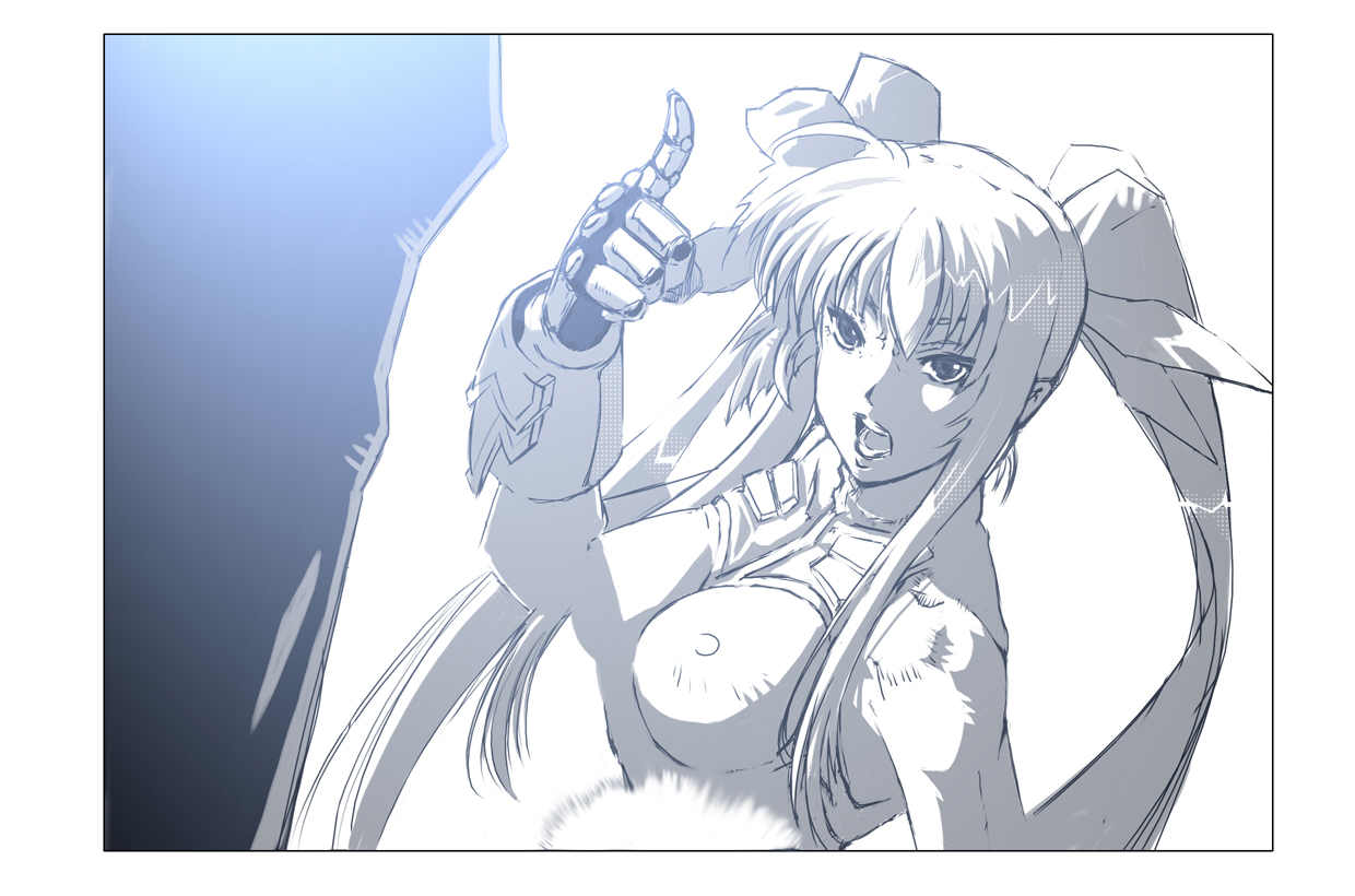 maki (seventh heaven maxion), latune subbota, banpresto, super robot wars, super robot wars original generation, 1girl, blue eyes, blush, dress, female focus, frills, long sleeves, mecha, purple hair, robot, short hair, solo