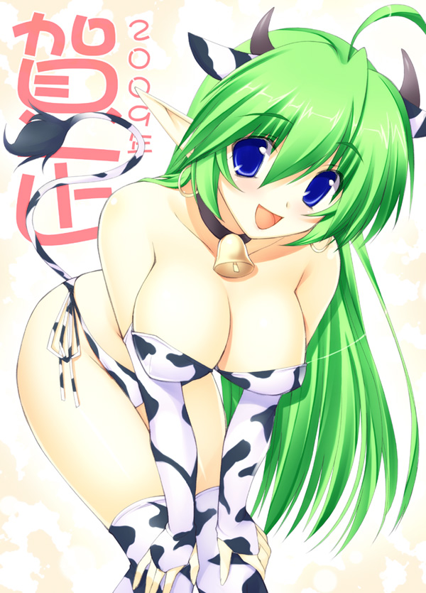00s1girl2009ahogeanimal earsanimal printbellbent overbikiniblue eyesbreastscleavagecollarcow printearringselbow gloveselffemale focusglovesgreen hairhappyhornsjewelrylarge breastslong hairneck bellnew yearpointy earsside-tie bikini bottomsoloswimsuittailthighhighs