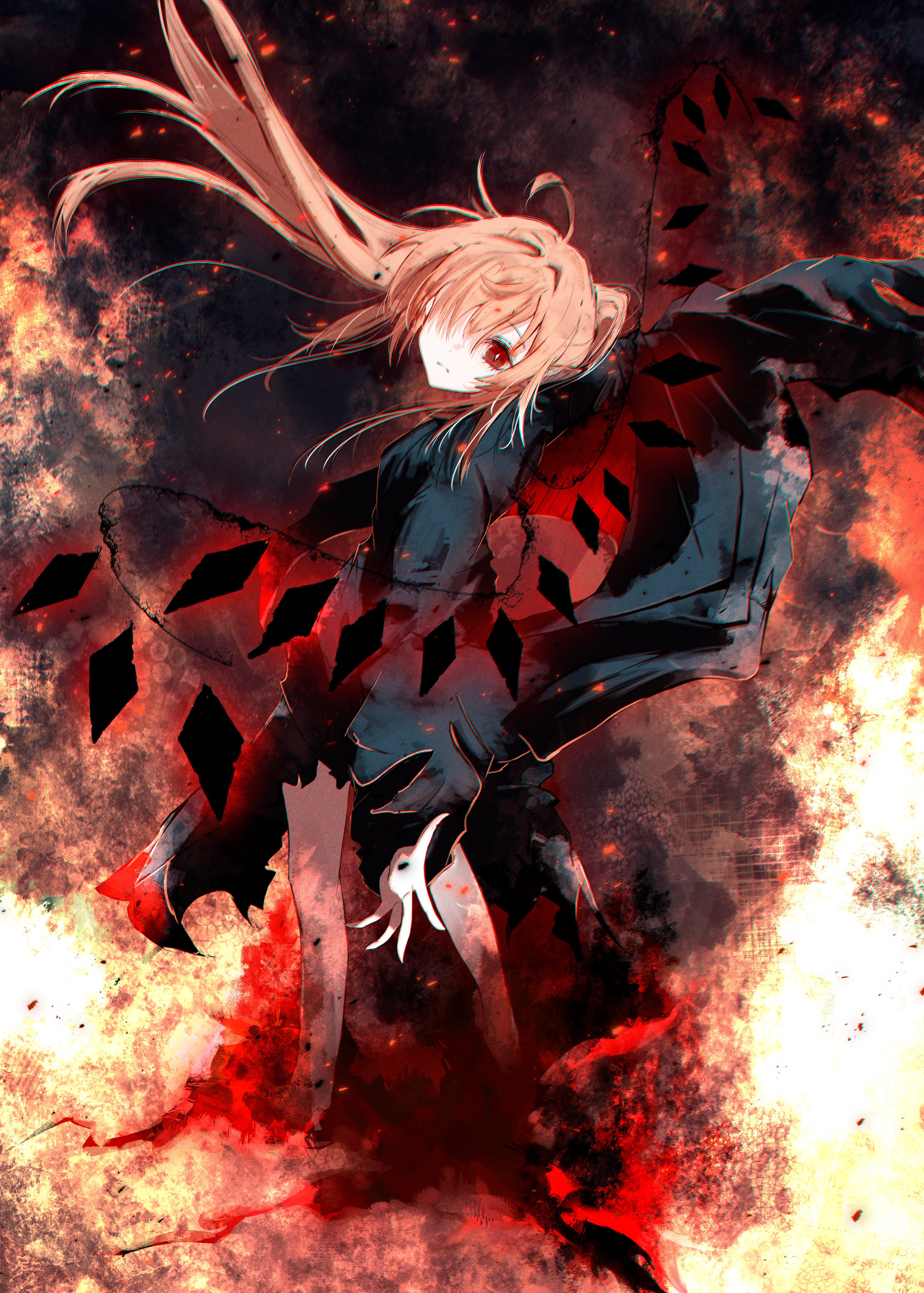1girlaurablack dressblonde haircrystal wingsdark auradestructiondressfeathersfireglowingglowing eyeslong hairred eyeswings