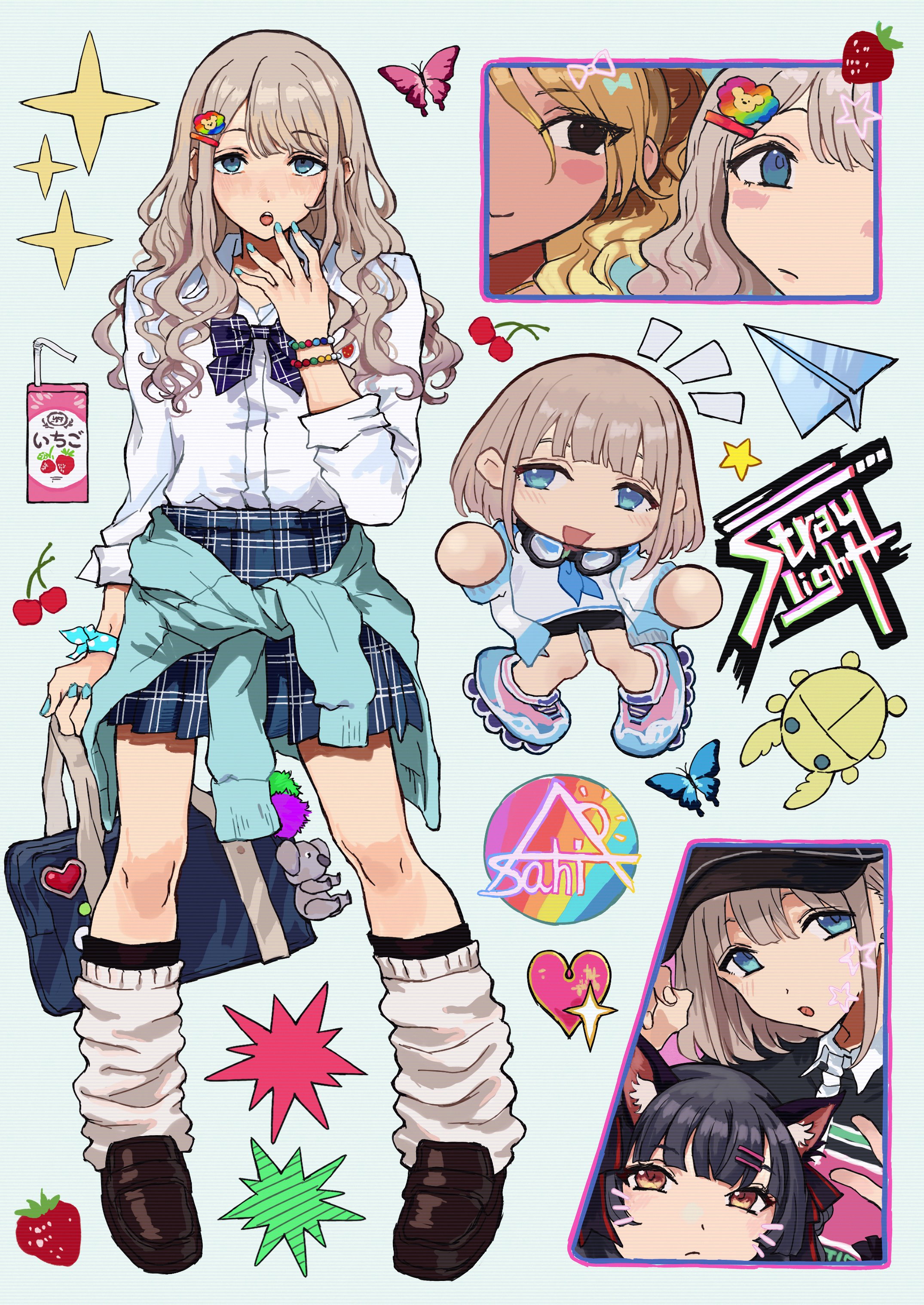 kannagi6, cure zukyuun, purirun (precure), kimi to idol precure, precure, commentary request, highres, 1girl, :d, beads, blush, blush stickers, bow, bracelet, character name, chibi, chibi inset, closed eyes, closed mouth, colored tips, dress, earrings, eating, eighth note, elbow gloves, food, fork, fortissimo, gloves, glowstick, gold bracelet, green hair, green scrunchie, hair beads, hair extensions, hair ornament, hair ribbon, hair scrunchie, halftone, halter dress, halterneck, hand on own face, happy, heart, holding, holding fork, holding glowstick, jewelry, layered dress, long hair, looking at viewer, magical girl, multicolored hair, multiple bracelets, multiple earrings, multiple views, musical note, musical note hair ornament, notice lines, open mouth, outline, pink eyes, plaid clothes, plaid dress, plaid ribbon, pleated sleeves, ribbon, scrunchie, single bare shoulder, single sleeve, smile, sparkle, star (symbol), upper body, w, waist bow, watermark, white background, white bow, white dress, white gloves, white outline, | |