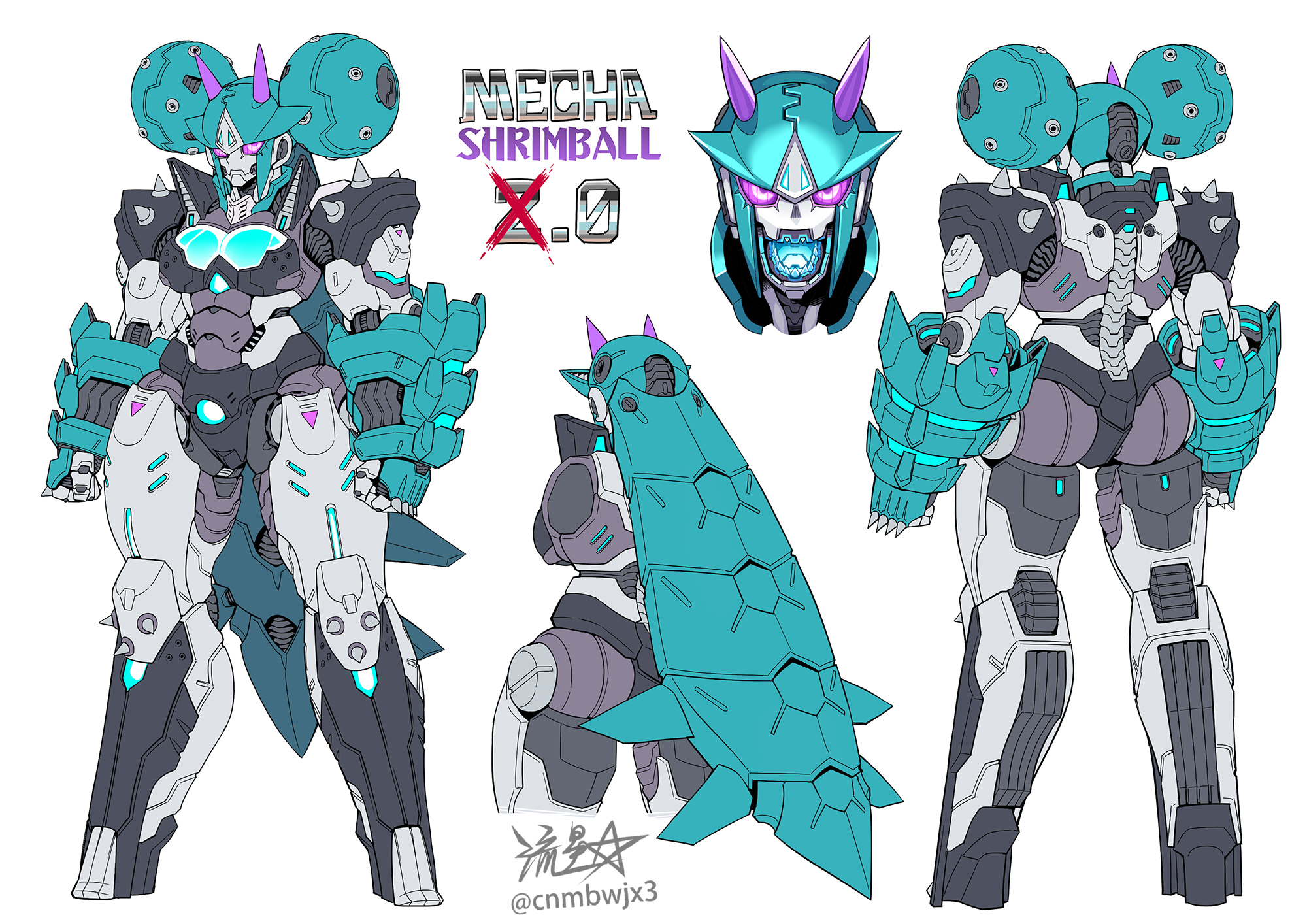 1girlaqua hairbreastscharacter nameclenched handsdouble bunhair bunhornslarge breastslong hairopen mouthpurple eyespurple hornsrobot girlsharp teethshrimball (ryuusei (mark ii))signatureteeththick thighsthighstwitter usernamevery long hair