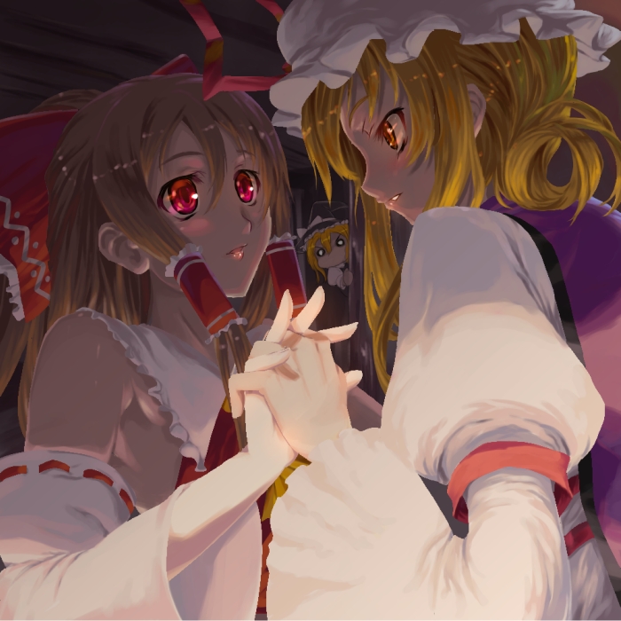 2girls3girlsblonde hairblushbrown hairchibidarkeye contactfemale focushair tubeshatholding handsinterlocked fingersjapanese clothesjealouslong hairlong sleeveslooking at anothermikomultiple girlsparted lipspuffy long sleevespuffy sleevesred eyeswide sleeveswitchwitch hatyuri