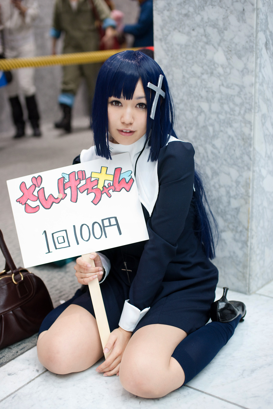 1girlasiancosplaycrossfemale focushigh heelsholdingholding signkneehighskneelinglong hairpurple hairshoessignsockssolo