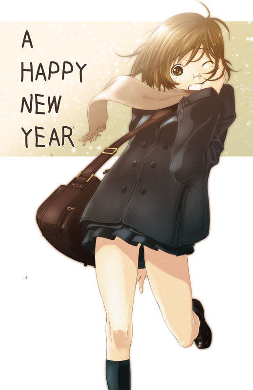 1girlbagbrown eyesbrown haircoatduffel bagfemale focuskneehighsleg liftnew yearone eye closedscarfschool bagshort hairskirtsnowsockssolotearswink