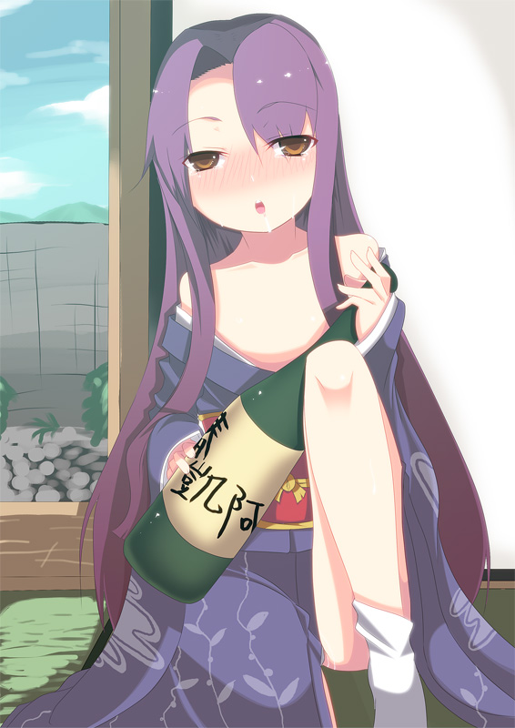 1girlalcoholbottlebrown eyesdrunkfemale focusjapanese clotheskimonolong hairnew yearpurple hairsakesittingsockssolo