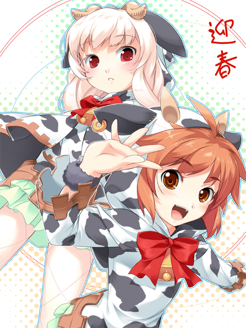 00s20092girlsalbinoanimal printbellblushbowbrown eyesbrown haircow printhoodhoodiehornsmultiple girlsnew yearpantyhosered eyesskirtwhite hairwristband