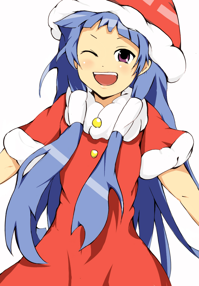 00s1girlblue hairblunt bangschristmasfemale focushair tubeshatlong hairone eye closedpurple eyessanta costumesanta hatsolowink