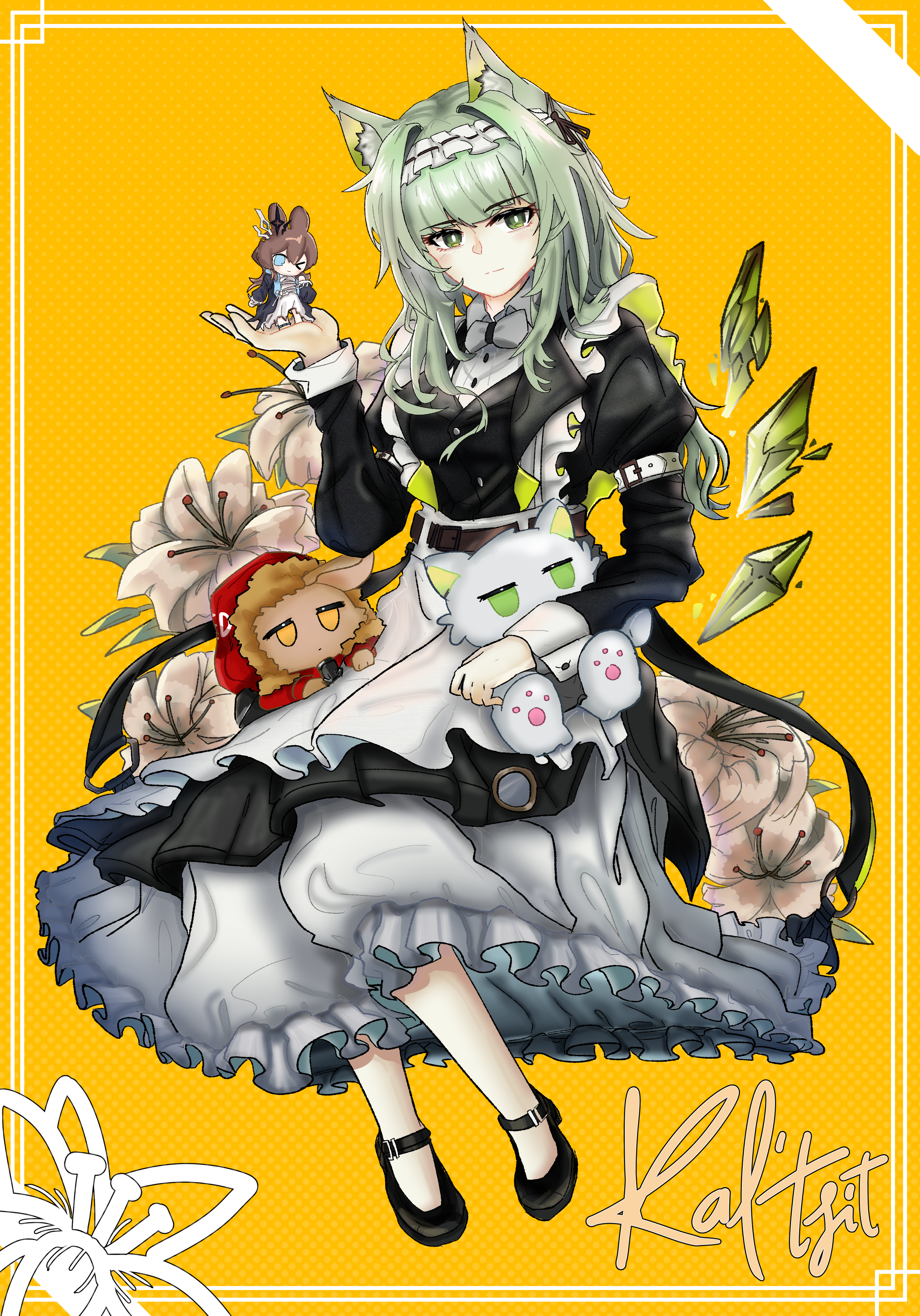3girlsanimal ear fluffanimal earsblack dressblue eyesbrown haircat earscirc333closed mouthdressflowerfrillsgreen eyesgreen hairholdingjuliet sleeveslong hairlong sleeveslooking at viewermaidmaid headdressmultiple girlsofficial alternate costumepuffy sleevesrabbit earsstuffed toyyellow eyes