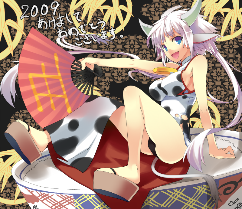 00s1girl2009animal earsanimal printbowlchina dresschinese clothescow earscow printdressfemale focusfolding fanhand fanholdingholding fanhornsnew yearpantiesrice bowlsandalssolounderwearwhite hair